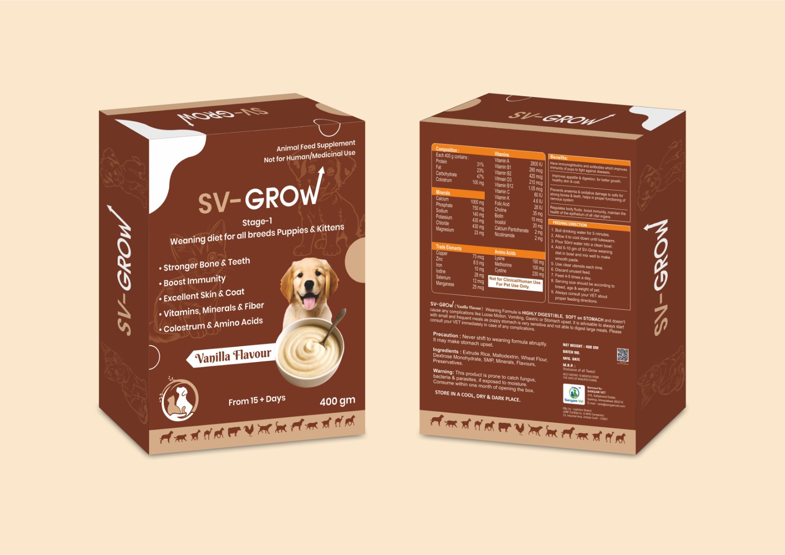 SV-GROW (Egg Flavour) Weaning Formula is HIGHLY DIGESTIBLE, SOFT on STOMACH and doesn’t cause any complications like Loose Motion, Vomiting, Gastric or Stomach upset. It is advisable to always start with small and frequent meals as puppy stomach is very sensitive and not able to digest large meals. Please consult your VET immediately in case of any complications.